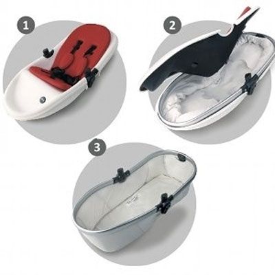 - Иновативна система за преобразуване на основния кош на количката от летен в зимен и обратното за 15 секунди (патентованата от Mima седалка се превръща в кош за новородено само с разкопчаване на цип);