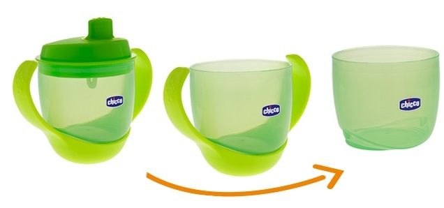 - Постепенно се преминава към втората стъпка от употребата на чашата, а именно премахването на капака с твърд накрайник. Дръжките имат специална форма, която улеснява захвата и приканва детето самостоятелно да държи чашата.