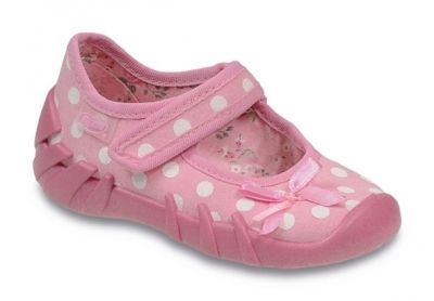 Детските пантофки на полската фирма Befado са със свободно дишащо ходило и отговарят изцяло на изискванията на ортопедите за правилния растеж и развитието на детското краче. Те са леки, удобни и не предизвикват изпотяване благодарение на естествените материали с които са направени, от които са изработени и дишащата основа и са много добър избор както за използване у дома, така и за навън като обувки за игра. Имат подсилени пети, които държат здраво глезените, за да не се кривят краката и гумирано удължение в областта на пръстчетата, което ги предпазва при игра. За по-лесно обслужване от детето се закопчават посредством велко лепенки и са изключително подходящи за използване в детската градина.