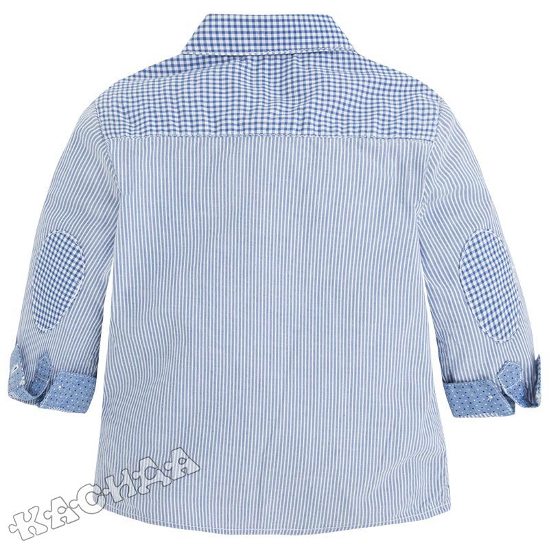 Бебешката риза изцяло спазва концепцията на испанската фирма Mayoral, да осигури на детето комфорт и не на последно място да изглежда изключително добре. Кройката е права, а ризката е в нежно син цвят, комбиниран със тъмносиньо каре на раменете и покрай илиците . Изработена е от висококачествена мека материя, приятна на допир, което я превръща в изключително добър избор за всяко малко момченце.