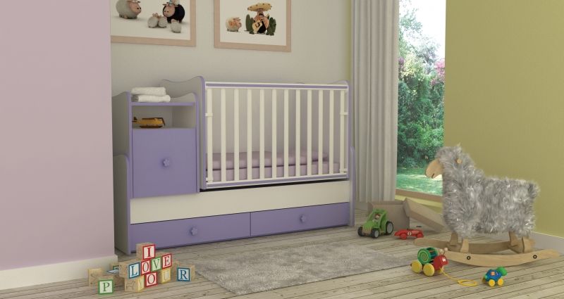За допълнително удобство на родителите шкафът може да бъде монтиран отляво или отдясно на люлката, според пространството и разпределението на мебелите в стаята. Тои има повдигнати страници на плота за повиване, така че да е безопасен за детето и ракла с капак, вградена дръжка и механизъм за безшумно затваряне. Да се върнем на решетката, нейният нов дизайн позволява да демонтирате 2 от пръчките, така че детето само да излиза и влиза в кошарката, като в същото време да е обезопасено по време на сън. Самата решетка може да бъде махната изцяло, ако Вие и детето Ви прецените, че така леглото ще е по-удобно за него.