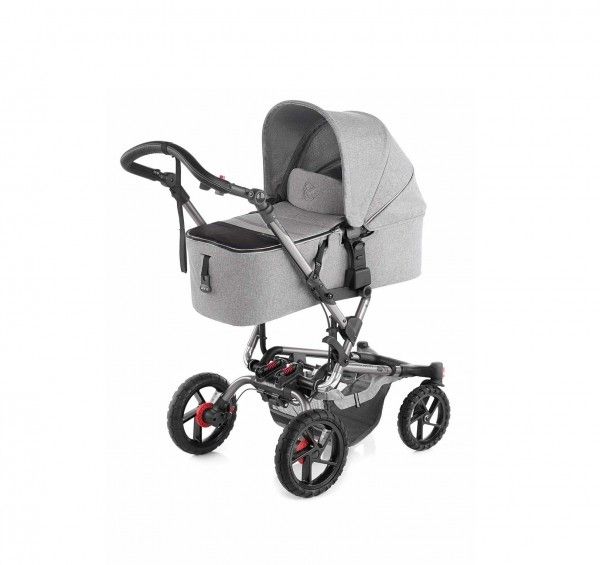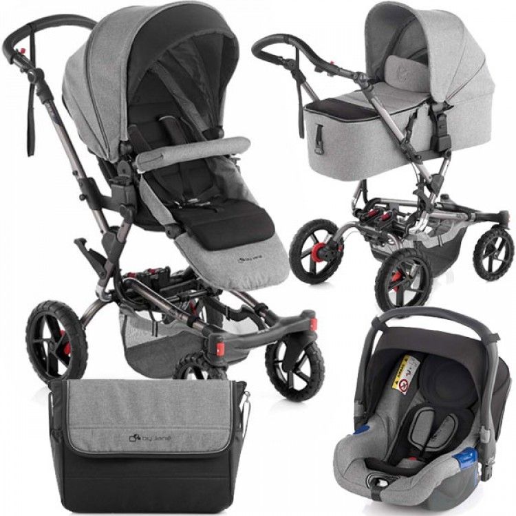 Комплектът на детска количка Jane Crosswalk Micro Koos се състои от здрава алуминиева рамка с четири PU гуми, кош за багаж, лятна седалка със сенник, кош за новородено Micro, столче за кола (0-13 кг), чанта за аксесоари, дъждобран.