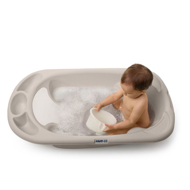 Baby Bagno на Cam е широка и удобна бебешка ваничка, която сякаш расте с Вашето дете. Ваничка е с разделение, с анатомична подложка с гумирана основа, на която може лесно и с една ръка да изкъпете по-малките бебенца на възраст от 0 до 6 месеца, а за по-големите е другата страна на Baby Bagno, Cam, която също е снабдена с нехлъзгаща се част, където децата от 6 до 12 месеца могат да седнат стабилно и удобно. Ваната е оборудвана с отделение за тоалетни принадлежности, а в комплекта му е включена пластмасова каничка за поливане на бебенцето. Ваничката Baby Bagno на Cam може да се използва с универсална стойка Stand Universale, която не е включена в комплекта и може да бъде закупена отделно.