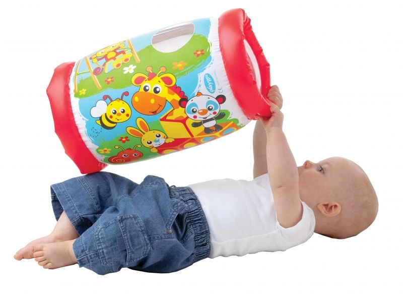 Надуваемата играчка на Playgro предлага чудесно забавление за детето. Тя ще осигури часове на търкаляне, акробатика и активна игра за вашето дете. Играчката има цилиндрична форма и това спомага детето да развива своите основни моторни умения. Докато си играе с валяка ще чува звънтенето на търкалящи се топки вътре в него.