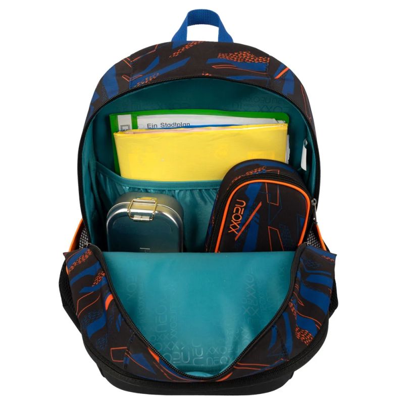 Изработена от рециклиран полиестер, раницата Neoxx Boom не само изглежда добре, но също така е екологично съобразена. С вместимост от 20 литра и тегло от само 700 грама, тя е идеална за носене на всички учебници, тетрадки и лични вещи. Раницата има две основни отделения, преден джоб, органайзер, специален джоб за електронно устройство до 15", дишащ гръб, подсилено дъно. Направена от 100% рециклирани пластмасови бутилки.