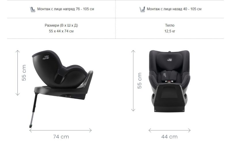 Иновативната система, която позволява то да бъде завъртяно на 360 градуса улеснява родителите и позволява смяна на позициите по посока на движението или обратно на посоката на движение без да се налага да се демонтира изцяло. Тази уникална система улеснява качването и слизането на детето, което е изключително важно удобство особено, когато детето порастне.  Монтажът на столчето се извършва с помощта на IsoFix система, закрепваща се за тази на автомбила, осигурявайки повече стабилност и по-сигурна защита особено в случаите на фронтален удар. Изофикс системата, която е вградена в модела е разработена от Britax Romer, преминала е редица тестове и е така направена, че да оптимизира ефекта на защита. Доказано е, че само 30% от столчетата за кола, които се монтират с предпазните колани на автомобила са поставени по правилен начин, а при монтаж с изофиск ситема този процент е 96, което гарантира правилното използване на столчето и оптималните му показатели при еветуален инцидент. Столчето за кола DualFix на Britax Romer може да бъде използвано обратно на посоката на движение за деца от раждането до около 9 месечна възраст, а за по-големите в зависимост от индивидуалната структура и удобство при возене може да изберете да го поставите отново монтирано обратно на посоката на движение или по посока, ако липсва достатъчно място за крачетата на детето.