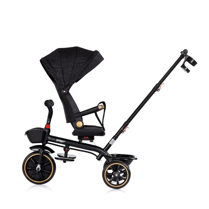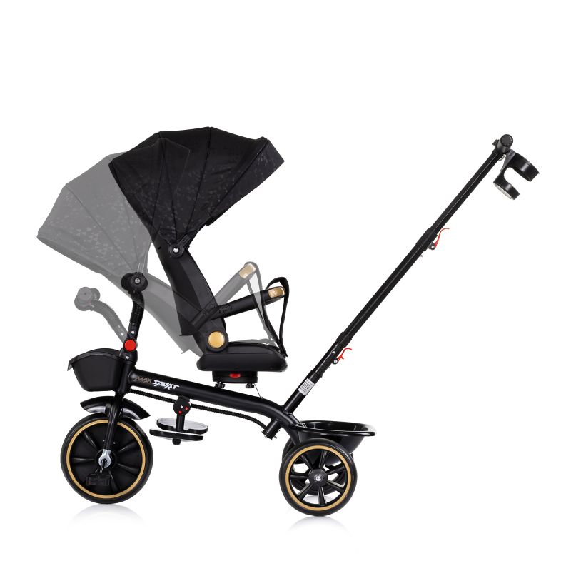 Детската триколка на Чиполино Макс Спорт позволява трансформация според възрастта на детето – от родителски контрол с дръжка до самостоятелно каране. Сенника, дръжката и предпазния борда се отстраняват и играчката се трансформира в триколка за по-голямо дете.