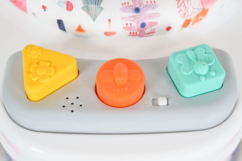 Докато се учи да стои самостоятелно и да прави своите първи крачки, детето ще се забавлява от сърце, ангажирано с интересните цветни играчки на таблата пред него. Една от включените играчки е с музикална функция. Седалката на бънджито може да се регулира в 3 различни позиции, според височината на детето, което осигурява по-голям комфорт и удобство. Също така тя може да се върти на 360 градуса.