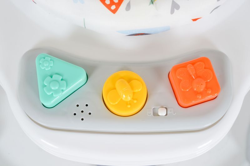 Докато се учи да стои самостоятелно и да прави своите първи крачки,  детето ще се забавлява от сърце, ангажирано с интересните цветни играчки на таблата пред него. Една от включените играчки е с музикална функция. Седалката на бънджито може да се регулира в 3 различни позиции, според височината на детето, което осигурява по-голям комфорт и удобство. Също така тя може да се върти на 360 градуса.