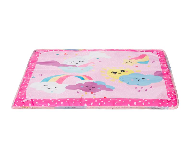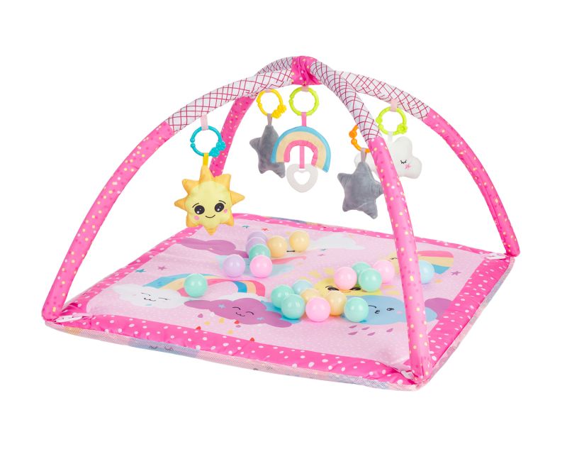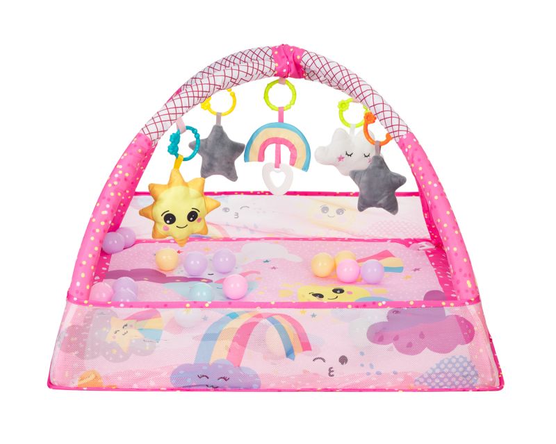 Активната гимнастика подпомага развитието на двигателните умения чрез движения като разтягане и ритане, като същевременно стимулира сетивата чрез мултисензорна игрална среда. Моделът разполага с интерактивни играчки и 18 цветни топчета, които привличат вниманието и насърчават активната игра. Допълнително удобство е функцията за затваряне на всички четири страни, която създава сигурно пространство за игра и предпазва топчетата от разпиляване
